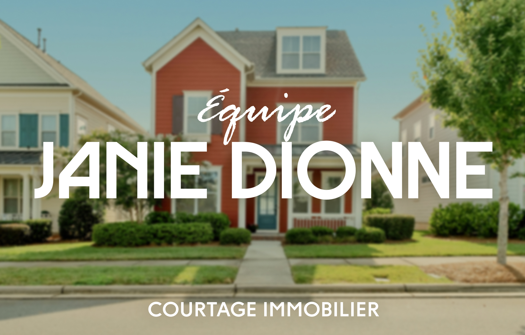 Visuel promotionnel de l'Équipe Janie Dionne en courtage immobilier, avec une maison rouge en arrière-plan légèrement floutée et un texte en blanc mettant en avant le nom de l'équipe.